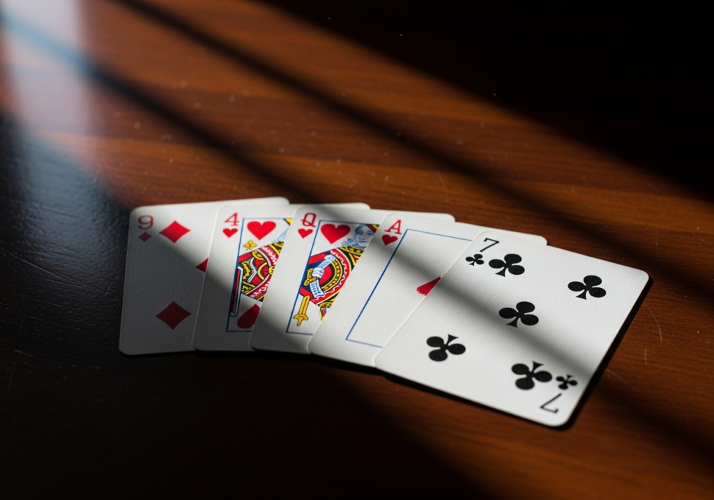 - Arrange the cards: Lay the five cards face up in a row in the following order: 9 of Diamonds, 4 of Hearts, Queen of Hearts, Ace of Diamonds, 7 of Clubs.